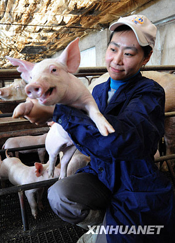 12月25日,天津薊縣建和養(yǎng)殖場場長鄭娜在查看豬仔。2001年底,大學(xué)畢業(yè)一年多、在北京一家軟件公司任市場部經(jīng)理的北京女孩鄭娜,放棄了優(yōu)越的都市生活,來到天津薊縣東施古鎮(zhèn)南孟莊村她父親創(chuàng)辦的養(yǎng)豬場當(dāng)上“豬倌”。幾年來,在鄭娜的努力下,養(yǎng)殖場從最初仔豬存欄100頭,發(fā)展到存欄1000多頭,年產(chǎn)仔豬5000頭。她還建立起養(yǎng)豬信息網(wǎng),牽頭成立了養(yǎng)豬協(xié)會,幫助當(dāng)?shù)仞B(yǎng)豬戶科學(xué)養(yǎng)殖,并生產(chǎn)出“無抗肉”銷往日本,F(xiàn)在,鄭娜正計劃用5年時間,把養(yǎng)豬場發(fā)展成為存欄萬頭,集飼養(yǎng)、加工為一體的現(xiàn)代化生態(tài)園區(qū)。 | |