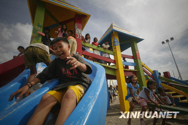 12月26日,在菲律賓首都馬尼拉的一個貧民窟,孩子們在剛設(shè)立的兒童游樂場內(nèi)嬉戲。