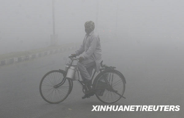 12月29日,在印度北部城市昌迪加爾,一名男子在大霧中騎行。新華社/路透
