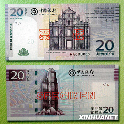 圖為中國銀行澳門元新版鈔票20澳門元票樣。20澳門元鈔票的正面主景圖案為大三巴牌坊。 |