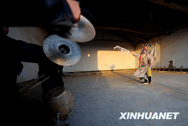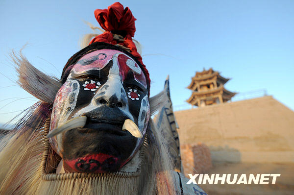 1月7日,高臺(tái)縣羅城鄉(xiāng)紅山村村民、48歲的藺耀宗在進(jìn)行秦腔獠牙特技表演。