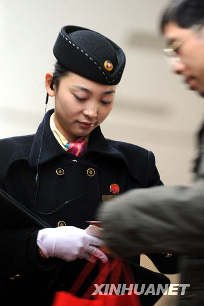 1月8日,長沙開往北京西的Z17列車女子乘務組乘務員為一名旅客服務。1月8日,隨著30組臨客在長沙的全部集結到位,廣鐵集團2009年春運湖南地區(qū)準備工作基本就緒。2009年春運將于1月11日正式開始,長沙客運段已備足全部旅客列車的相關物品,并吸取去年冰雪災害運輸教訓,制定應急預案,儲備應急設備,確保春運工作安全有序進行。