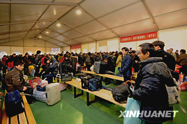 1月10日,旅客在杭州火車站“春運大棚”候車。當(dāng)日,杭州火車站新建的兩座春運候車大棚正式啟用?偯娣e1500平方米的大棚內(nèi)配有照明、保溫、座椅和開水供應(yīng)等設(shè)施,讓候車旅客免受嚴(yán)寒之苦。據(jù)介紹,杭州火車站和杭州火車東站首次在車站廣場搭建“春運大棚”,新增候車能力6000人。