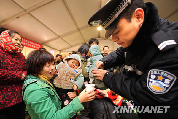 1月10日,杭州火車站派出所民警余鵬在“春運大棚”里為候車旅客倒開水。