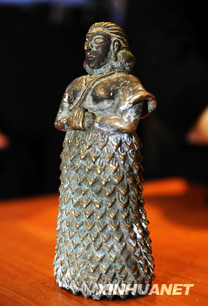 這是1月11日拍攝的埃及歸還給伊拉克的一尊兩河文明時期的銅像。當日,埃及最高文物委員會主席哈瓦斯代表埃及將一尊兩河流域文明時期的婦女銅像歸還給伊拉克政府。2005年,一名埃及人試圖將這尊銅像走私進入埃及時被埃及海關(guān)查獲。經(jīng)埃及文物部門的考證和鑒定,銅像創(chuàng)作于兩河流域文明時期,描繪的是一名正在祈禱的婦女。