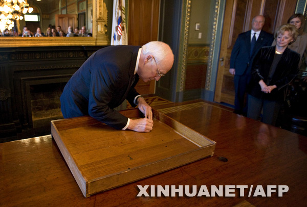 1月12日,美國(guó)副總統(tǒng)切尼在艾森豪威爾行政辦公樓的副總統(tǒng)辦公桌抽屜上簽下了自己的名字。新華社/法新