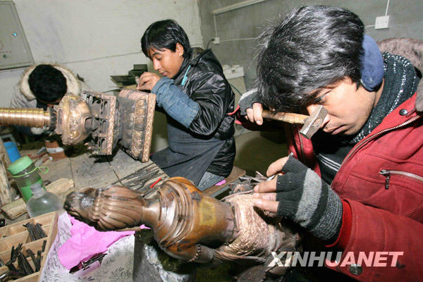 尼泊爾技師巴格達(前)在鏨刻銅質(zhì)佛像(1月13日攝)。安徽帝雅文化遺產(chǎn)研究保護中心針對宗教藝術(shù)品的市場需求,從尼泊爾聘請六名富有經(jīng)驗的鏨刻技師,開發(fā)宗教銅器藝術(shù)品。