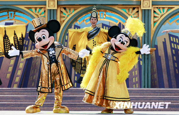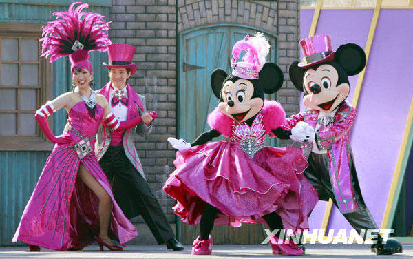 1月19日,在日本東京附近的迪斯尼樂園,米奇和米妮穿上嶄新的服裝在舞臺上表演。