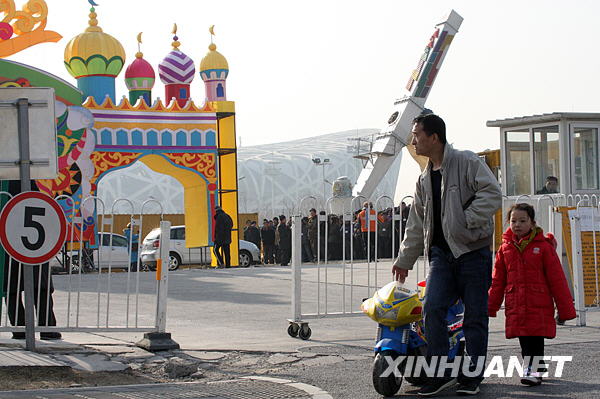 1月19日,工人們在位于國家體育場“鳥巢”東北側(cè)的嘉年華主題公園內(nèi)施工。目前,北京奧運中心區(qū)內(nèi)正在加緊建設(shè)嘉年華主題公園,該項目占地約4萬平方米,將于春節(jié)前后向市民開放。