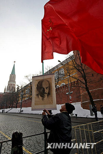 1月21日,在俄羅斯首都莫斯科紅場附近,一名俄共老黨員高舉掛有列寧像的紅旗。當日,數(shù)百名俄共黨員及普通民眾舉行活動,紀念列寧逝世85周年。1921年1月21日,無產(chǎn)階級革命的偉大導(dǎo)師列寧在莫斯科附近的哥爾克村逝世,享年54歲。