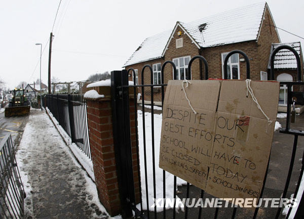 2月5日,英國英格蘭中部希瑟的一所學校在大門口掛上了學校關閉的告示牌。繼1日晚遭遇罕見降雪后,英國5日迎來一周內第二場大雪,交通受到嚴重干擾,融雪用鹽存量告急,數(shù)以千計的學校被迫關閉。新華社/路透