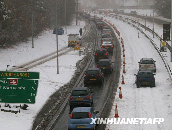 2月5日,在英國首都倫敦以北,大雪造成通往盧頓機場的一條公路交通堵塞。當天,英國威爾士南部、英格蘭中部和西部、北愛爾蘭和倫敦以北地區(qū)再遭大雪襲擊。新華社/法新