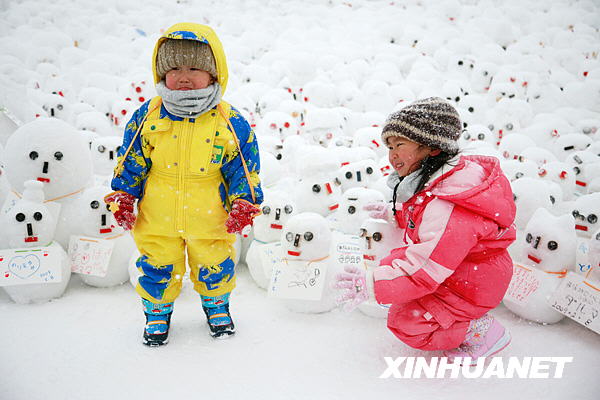 2月8日,在日本北海道札幌市舉行的第60屆札幌冰雪節(jié)上,兩名小孩在雪人旁玩耍。作為日本北海道的傳統(tǒng)節(jié)日,札幌冰雪節(jié)是游人們親近自然的好舞臺。冰雪節(jié)的組織者特別開辟了供人堆雪人、制作雪雕的場地,讓人們充分感受冰雪的魅力。