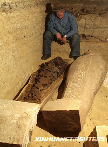 這張由埃及最高文物委員會(huì)2月9日公布的照片顯示,該委員會(huì)主席扎希·哈瓦斯坐在一具新出土的木乃伊旁。新華社/路透埃及考古學(xué)家當(dāng)天表示,他們?cè)谑锥奸_(kāi)羅以南塞加拉地區(qū)一座有2600多年歷史的墳?zāi)怪邪l(fā)現(xiàn)了20多具木乃伊。該墳?zāi)箍勺匪葜凉?40年,正值第26王朝時(shí)期。新華社/法新