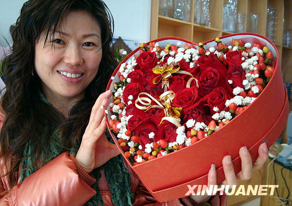 2月10日,一名顧客展示剛購買的心形玫瑰禮盒。隨著情人節(jié)臨近,蘇州各花店的玫瑰花開始走俏。