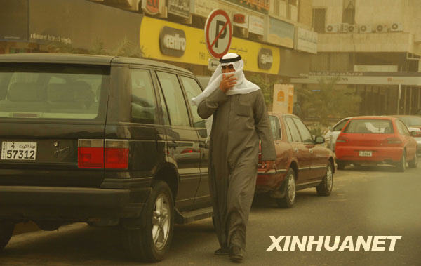 2月11日,在科威特街頭,一男子用頭巾捂住口鼻遮擋風(fēng)沙。2月11日,科威特遭遇今年以來(lái)的最強(qiáng)沙塵天氣,天空變成灰蒙蒙的一片,沙漠地區(qū)能見(jiàn)度降低到幾十米。