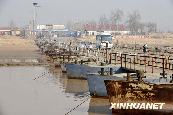 隨著黃河水量減少,黃河濟(jì)南濼口段浮橋已有三分之二“浮不起來”(2月11日攝)。