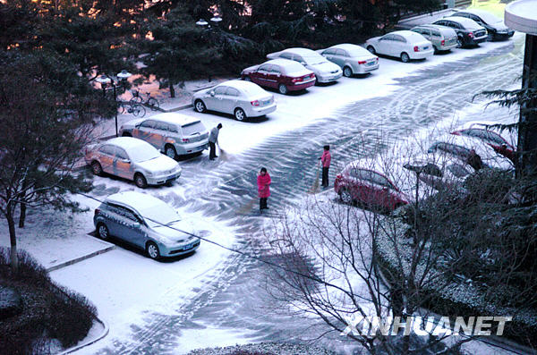 2月17日晨,在北京石景山區(qū)一居民小區(qū)內(nèi),居民在打掃小區(qū)道路上的積雪。當(dāng)日,北京喜降春雪,市區(qū)一片銀白景象。