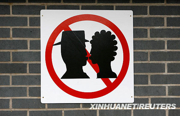 2月16日在英國(guó)沃靈頓的火車站拍攝的照片顯示的是一個(gè)禁止接吻的標(biāo)志。據(jù)當(dāng)?shù)孛襟w報(bào)道,該標(biāo)志是禁止乘客與開車送客的人長(zhǎng)時(shí)間接吻擁抱,以防汽車將車站通道堵塞。新華社/路透