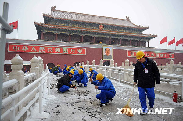 2月18日,工人在天安門金水橋上施工。 為迎接新中國成立60周年,天安門管委會從當日起對金水橋?qū)嵤┍Wo修繕,工程擬于2009年5月1日前完工,并整體對外開放 經(jīng)專家鑒定,金水橋主要存在石質(zhì)文物風化、橋欄板欄桿局部開裂、橋面石材磨損等問題,亟待保護維修。據(jù)悉,此次修繕工作將分階段進行,由于施工圍擋防火板高度有限,因此金水橋和天安門城樓的整體景觀和游覽不會受到太大影響。