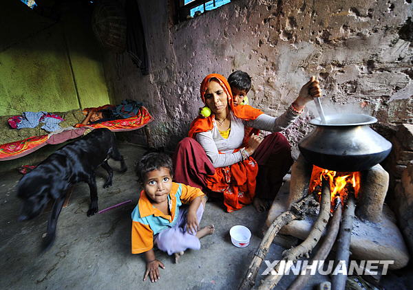 2月19日,在位于印度新德里南部的一處貧民窟內(nèi),一名婦女和她的幾個(gè)孩子在屋內(nèi)做飯。這間屋子既是臥室,又是廚房和廁所。 |