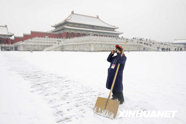 2月19日,北京故宮博物院的一位清潔工在工作間隙拍攝雪景。經(jīng)過連續(xù)3日的降雪,北京故宮銀裝素裹,別有一番韻味。