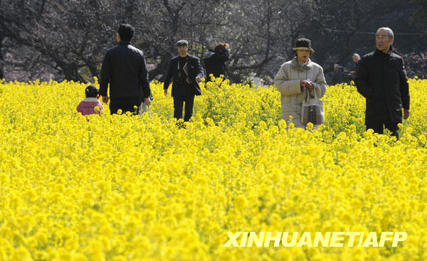 2月22日,在日本東京的一個(gè)公園里,游客們漫步在油菜花叢中。新華社/法新