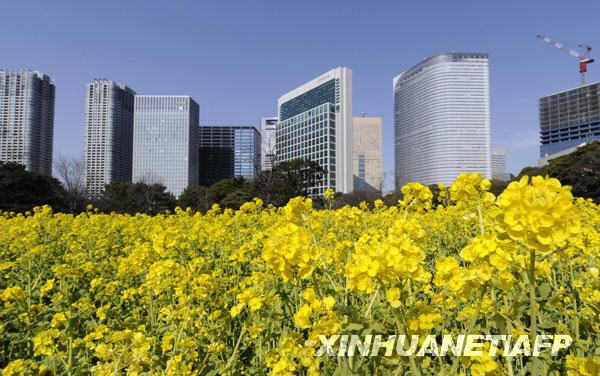2月22日,在日本東京的一個(gè)公園里,一朵朵油菜花在高樓大廈的背景下綻放。新華社/法新