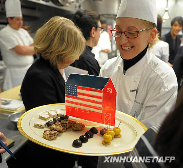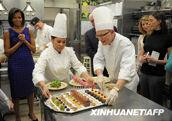 2月22日,在美國華盛頓白宮的廚房里,美國“第一夫人”米歇爾·奧巴馬(左)探望為宴請(qǐng)州長的晚餐而忙碌的廚師們。新華社/法新