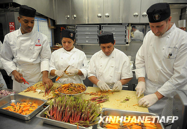 2月22日,在美國華盛頓白宮的廚房里,廚師們正在為宴請(qǐng)州長的晚餐而忙碌。新華社/法新