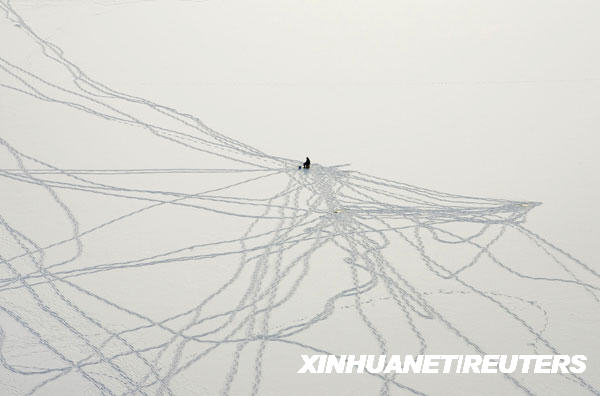 2月21日,在距白俄羅斯首都明斯克西南380公里的一個(gè)村莊附近,一名漁夫在冰雪覆蓋的湖面上釣魚。新華社/路透