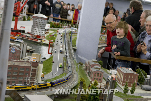 2月19日,在荷蘭城市鹿特丹,人們觀看一輛微縮玩具火車。這輛小火車約16米長,重12公斤,有3個(gè)火車頭。它有望打破“世界上最長微縮客運(yùn)列車”的紀(jì)錄。新華社/法新