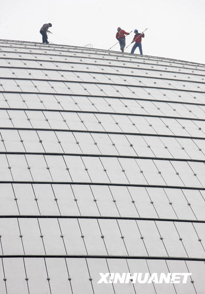 2月23日,工人在國家大劇院頂部進(jìn)行清潔工作。當(dāng)日,國家大劇院進(jìn)行例行清潔工作,清潔要持續(xù)5天左右。