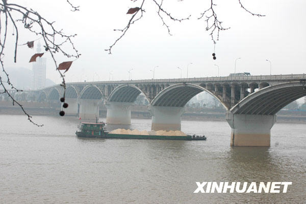 一艘貨輪駛過長(zhǎng)沙湘江橘子洲大橋(3月2日攝)。連日來持續(xù)的陰雨天氣,使湘江水位不斷上漲。湘江長(zhǎng)沙段水位由前段時(shí)間枯水期最低的25.23米,3月2日已上漲到27.07米,湘江長(zhǎng)沙段告別了持續(xù)近3個(gè)月的枯水橙色預(yù)警。