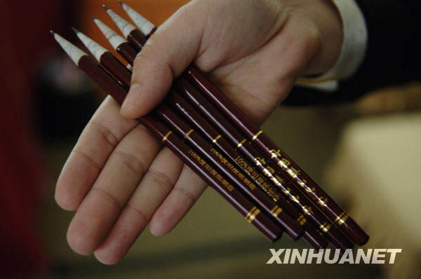 這是在安徽代表團(tuán)駐地拍攝的用廢舊報(bào)紙制造的環(huán)保鉛筆(3月4日攝)。十一屆全國人大二次會議各代表團(tuán)駐地紛紛采用環(huán)保鉛筆。