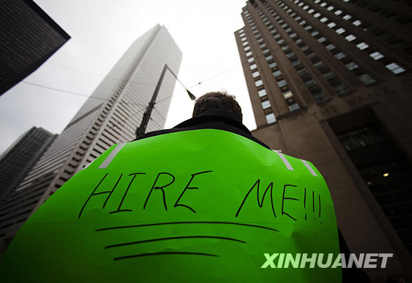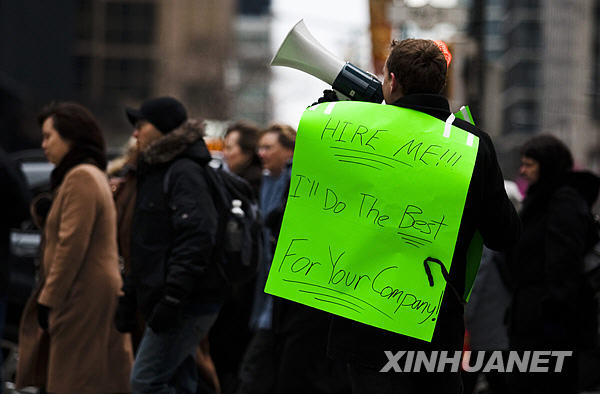 3月5日,在加拿大多倫多街頭,一名男子身披寫(xiě)有“雇用我吧!”字樣和個(gè)人簡(jiǎn)歷的紙衣,在街頭使用擴(kuò)音器找工作。據(jù)加拿大統(tǒng)計(jì)局公布的數(shù)據(jù),今年1月,加拿大新增失業(yè)人數(shù)達(dá)到12.9萬(wàn)人,創(chuàng)30年來(lái)月最高紀(jì)錄,失業(yè)率由2008年12月的6.6%升至7.2%。新華社/路透 |