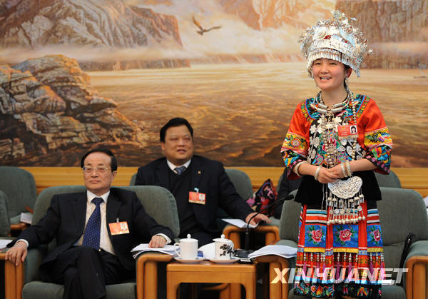 3月6日,出席十一屆全國人大二次會議的重慶代表團審議政府工作報告。全國人大代表、苗族姑娘李小燕在席間唱起山歌,表達喜悅心情。