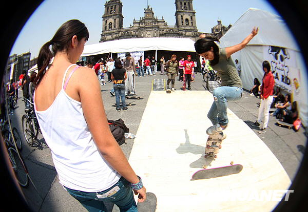 3月7日,在墨西哥首都墨西哥城的憲法廣場,女孩們進(jìn)行滑板表演。當(dāng)天,世界各地的人們用不同的方式慶祝國際勞動?jì)D女節(jié)。新華社發(fā)