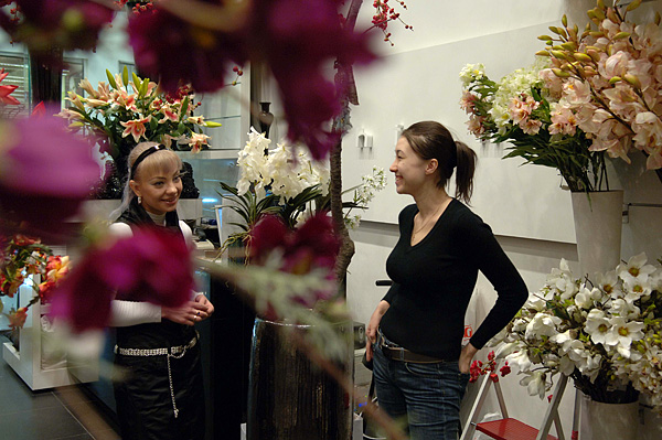 3月8日,哈薩克斯坦第一大城市阿拉木圖梅加購物中心一家鮮花店的女店員因節(jié)日期間生意興隆而眉開眼笑。新華社記者 趙宇 攝