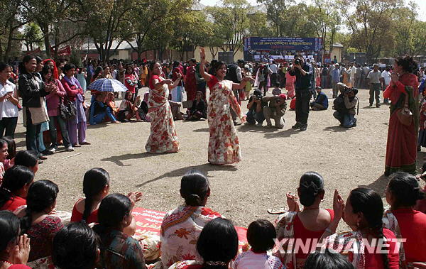 3月8日,尼泊爾首都加德滿都的婦女們穿上節(jié)日盛裝,載歌載舞慶祝自己的節(jié)日。新華社發(fā)