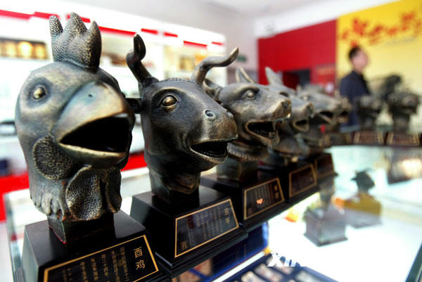 3月9日拍攝的在沈陽一家商店里展賣的微縮圓明園“獸首”紀(jì)念品。