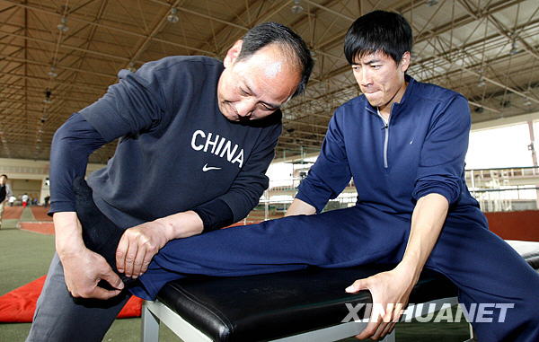 3月10日,孫海平教練對劉翔(右)受傷的右腳進行訓練。 當日,在美國手術及康復訓練了三個月的劉翔,在上海進行了回國后的首次公開訓練。
