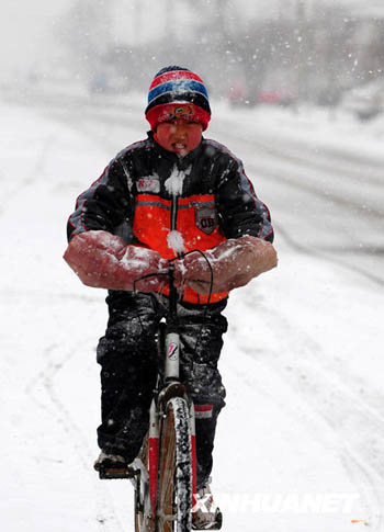 3月11日,一名少年騎車走在鄂爾多斯市杭錦旗獨(dú)貴塔拉鎮(zhèn)街頭。當(dāng)日,內(nèi)蒙古自治區(qū)中西部的呼和浩特、包頭、鄂爾多斯、巴彥淖爾等地出現(xiàn)大范圍降雪,氣溫隨之下降。