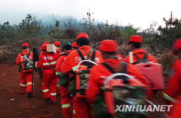 3月11日,專業(yè)撲火隊員正在前往火場開展撲救。