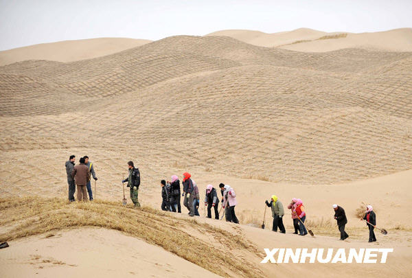 3月12日,寧夏靈武市白芨灘林場職工在毛烏素沙漠邊緣扎草方格。被騰格里、毛烏素、烏蘭布和三大沙漠包圍的寧夏回族自治區(qū)長年干旱少雨,是我國土地沙漠化最嚴重的地區(qū)之一。近年來,自治區(qū)不斷加大治沙力度,在沙漠邊緣大面積扎草方格固沙植樹,在沙塵源頭筑成一道“草長城”。目前全區(qū)已累計治理沙化土地47萬公頃,沙化土地面積由建國初的165萬公頃減少到目前的118.3萬公頃,在全國率先實現荒漠化逆轉。