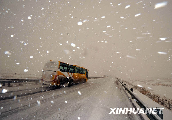 3月12日,一輛客車冒雪行駛在甘肅省張掖市山丹縣境內(nèi)。從3月11日起,甘肅河西走廊的武威、金昌、張掖等地部分地區(qū)喜降春雪,有利于緩解旱情、春播生產(chǎn)。