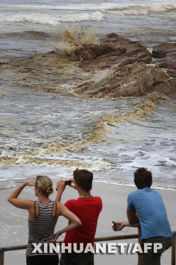 3月13日,在澳大利亞昆士蘭州庫魯姆,游客觀望被污染的海水。一艘貨輪11日在昆士蘭州附近海域遭遇風暴,導致約大量燃油泄漏,船上搭載的一些裝有化學品的集裝箱也落入海中。澳大利亞有關(guān)方面稱澳東北部數(shù)十個觀光海灘已被泄漏的燃油和化學品污染。新華社/法新