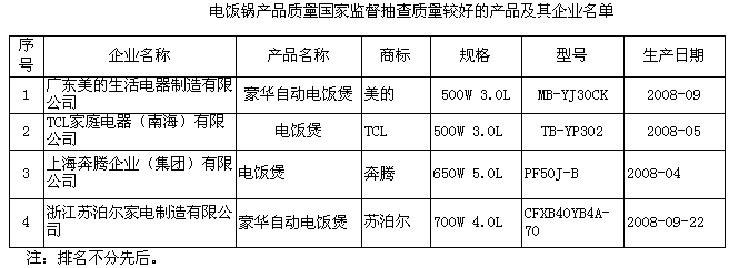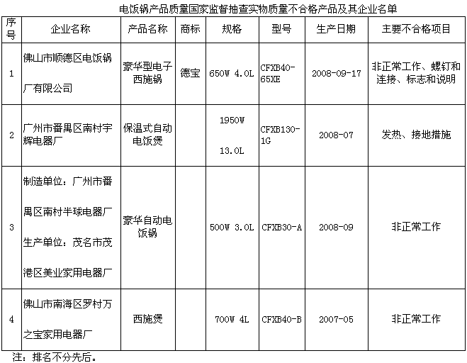 電飯鍋:抽查了廣東、浙江、上海、江蘇4個(gè)省、直轄市39家企業(yè)生產(chǎn)的40種產(chǎn)品,產(chǎn)品實(shí)物質(zhì)量合格率為90%。這次抽查,重點(diǎn)對(duì)觸及帶電部件的防護(hù)、非正常工作、發(fā)熱等16個(gè)安全指標(biāo)和2個(gè)電磁兼容指標(biāo)進(jìn)行了檢驗(yàn)。抽查中發(fā)現(xiàn)的主要質(zhì)量問(wèn)題是非正常工作和發(fā)熱不合格。