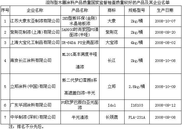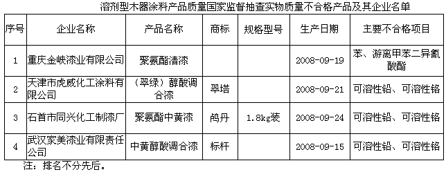 溶劑型木器涂料:抽查了北京、天津、上海、江蘇、浙江、安徽、山東、廣東、福建、湖北、四川、湖南、重慶、江西、廣西15個(gè)省、直轄市、自治區(qū)213家企業(yè)生產(chǎn)的213種產(chǎn)品,產(chǎn)品實(shí)物質(zhì)量合格率為98.1%。這次抽查,重點(diǎn)對(duì)溶劑型木器涂料的揮發(fā)性有機(jī)化合物、苯、甲苯和二甲苯總和、游離甲苯二異氰酸酯、重金屬等項(xiàng)目進(jìn)行了檢驗(yàn)。抽查中發(fā)現(xiàn)的主要質(zhì)量問(wèn)題是可溶性鉛、可溶性鉻、苯、游離甲苯二異氰酸酯不合格。