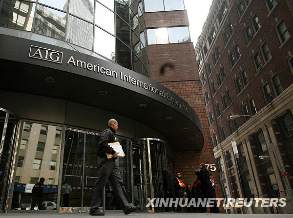 3月16日,一名行人從美國紐約的美國國際集團(AIG)大樓旁走過。美國總統(tǒng)奧巴馬16日表示,受政府救助的美國國際集團(AIG)向員工分發(fā)1.65億美元的獎金和續(xù)聘津貼的行為讓人“憤怒”,他已要求財政部長蓋特納通過杠桿工具和一切合法手段,阻止美國國際集團發(fā)放這筆資金。他并且表示,美國將加強金融監(jiān)管,確保不會再發(fā)生類似情況。新華社/路透